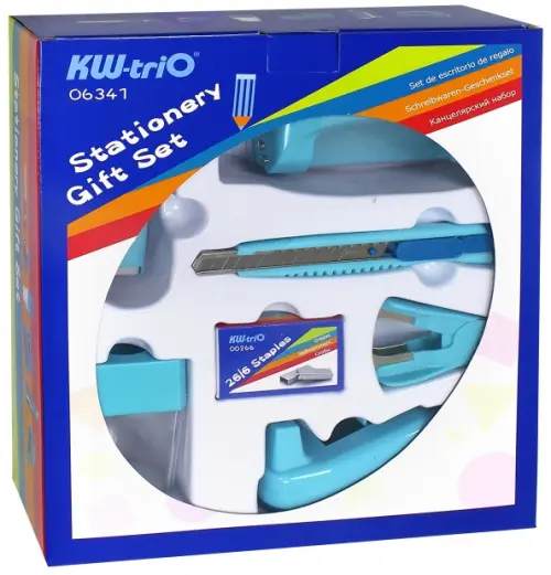 Состав набора: степлер 24/6, дырокол 20 листов, скобы 24/6, нож канцелярский, точилка, антистеплер, диспенсер для клейкой ленты.