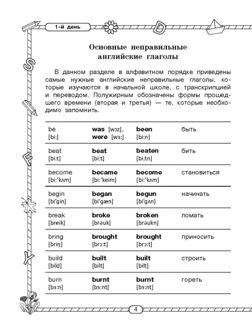 Учебное пособие разработано известными педагогами-практиками О.В. Узоровой и Е.А. Нефёдовой, авторами более 500 учебных пособий для начальной школы. Занимаясь по этой книге, ребёнок сможет не только легко понять и запомнить особенности спряжения английских неправильных глаголов, но и активно применять их в разговорной и письменной речи.