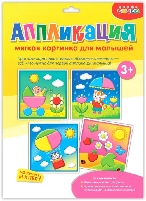 Яркая и выразительная аппликация с простыми и веселыми картинками. Для работы не нужны ни клей, ни ножницы. В комплекте — мягкие детали, вырубленные из объемного ЭВА на клеевой основе, которые легко приклеиваются на картинку-основу. Сама картинка небольшого размера, что поможет малышу легко справиться с работой. В результате получится прекрасная композиция — первая аппликация малыша! В набор входят четыре яркие картинки.
