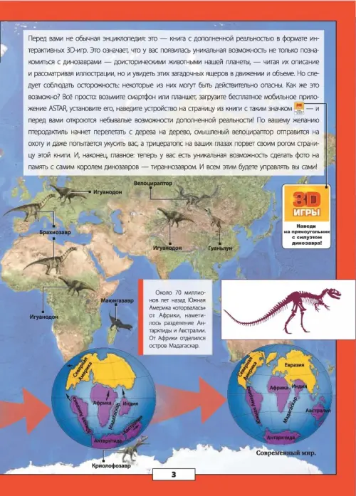 В настоящее время каждый знает, что много лет назад на нашей планете обитали необычные животные – динозавры. Однако никто их не видел вживую, так как давным-давно эти древние ящеры по какой-то неизвестной причине вымерли. Но всё вполне возможно, если вы откроете эту книгу. Ведь у вас в руках уникальное издание с дополненной реальностью (AR) в формате интерактивных 3D-игр. Это значит, что благодаря современным технологиям вы не просто будете читать текст и рассматривать иллюстрации, а сможете прямо на страницах книги увидеть динозавров воочию и даже услышать издаваемые ими звуки!