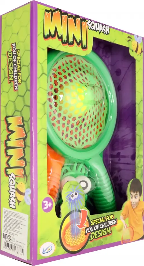 Игровой набор включает в себя 2 ракетки для мини-сквоша и забавный мячик с глазами. Суть сквоша заключается в том, что игроки поочередно после отскока мяча, которому предшествовал удар соперника, также должны отбить его, при этом не попасть в зону аута, которая находится за размеченным на ровной горизонтальной поверхности полем.