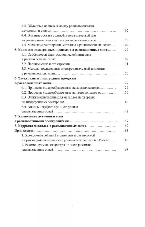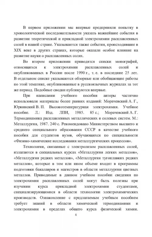 В учебном пособии изложены вопросы, связанные с электрохимией расплавленных солей (ионных расплавов), которая является теоретической основой производства большого числа металлов — алюминия, магния, лития, натрия, кальция, циркония и других. Ионные расплавы используются при рафинировании ряда металлов, синтезе тугоплавких соединений, производстве наноматериалов, в системах преобразования энергии. В учебном пособии в краткой форме рассмотрены физико-химические и термодинамические свойства расплавленных солей, особенности электрохимической кинетики, процессы электролиза, химические источники тока с применением расплавленных электролитов. Учебное пособие предназначено для студентов вузов, изучающих такие предметы, как «Металлургия легких металлов», «Металлургия редких металлов», «Прикладная электрохимия», при подготовке бакалавров и магистров по направлениям «Цветная металлургия» и «Технология электрохимических производств».