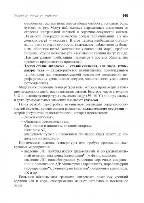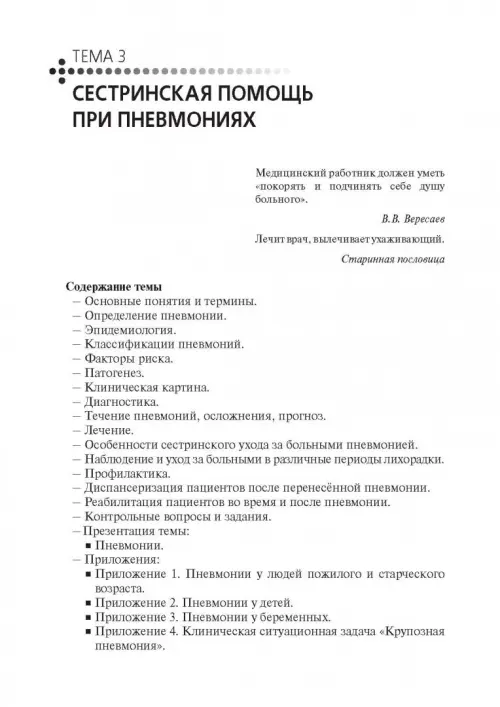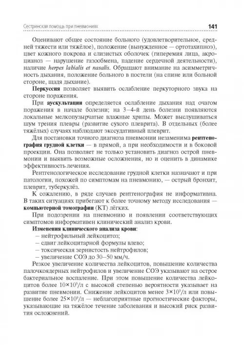 Темы учебника содержат перечень основных понятий и терминов, контрольные вопросы, тестовые задания для итогового контроля знаний. Теоретический курс учебника и мультимедийные презентации позволили подробно изложить практические аспекты сестринской деятельности (наблюдение и уход, сестринскую помощь больным бронхитом, пневмонией, бронхиальной астмой, при лёгочном кровотечении), проанализировать обучающие клинические ситуационные задачи по темам «Бронхиальная астма», «Острая очаговая пневмония, осложнённая абсцессом лёгкого», рассмотреть особенности парентерального питания, алгоритм ухода за дренажами в плевральной полости, при острой гнойной (аэробной) инфекции, за онкологическими больными, расширить информацию о газовом составе крови, спирометрии и методике её проведения.