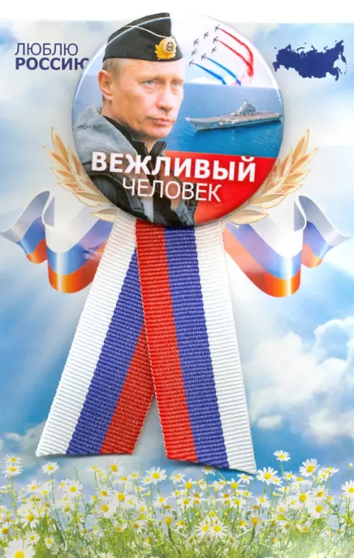 Значок с лентой-триколор "Путин В.В. Вежливый человек", 56 мм