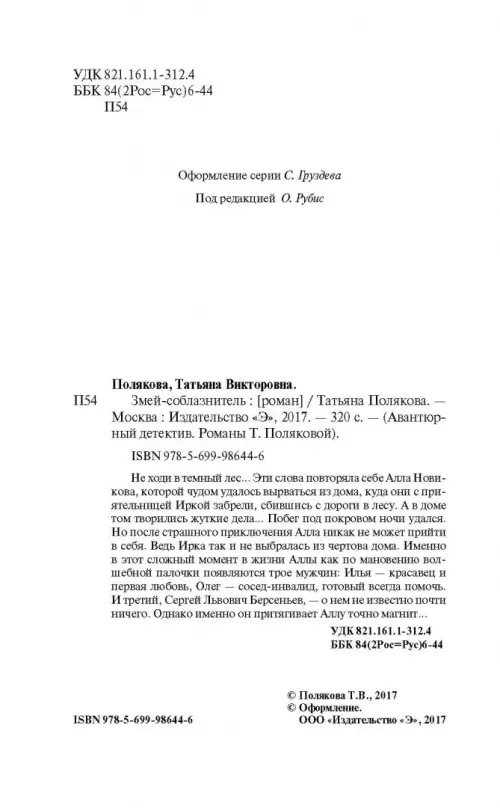 Если вы обнаружили ошибку в описании товара «Змей-соблазнитель» (авторы: Полякова Татьяна Викторовна), то выделите её мышкой и нажмите Ctrl+Enter. Спасибо, что помогаете нам стать лучше!