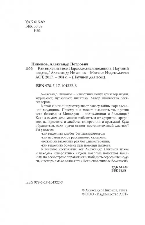 Если вы обнаружили ошибку в описании товара «Как вылечить все. Параллельная медицина. Научный подход» (авторы: Никонов Александр Петрович), то выделите её мышкой и нажмите Ctrl+Enter. Спасибо, что помогаете нам стать лучше!