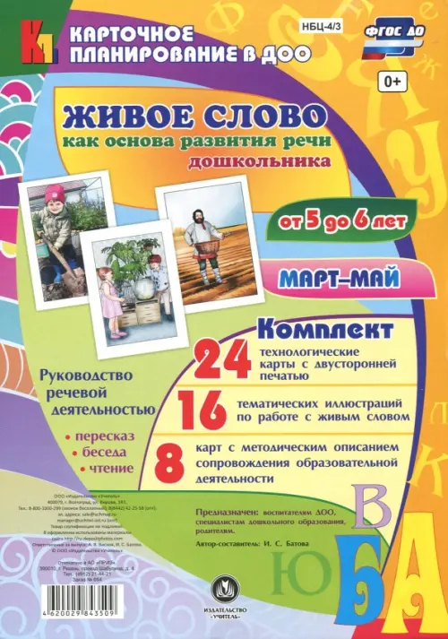 В комплекте, включающем 24 технологические карты и 16 тематических иллюстраций, а также методические рекомендации по организации образовательной работы по направлению "Речевое развитие" (разделы развитие связной речи и ознакомление с художественной литературой), раскрывается система работы по ознакомлению детей 5-6 лет с живым словом на март-май учебного года. В представленном карточном планировании описана педагогическая деятельность по совершенствованию речи дошкольников, обогащению словарного запаса, формированию умения правильно строить речевые высказывания в соответствии с ФГОС ДО, освещена методика развития словесного творчества детей младшего дошкольного возраста, рассмотрены сочетающиеся виды деятельности художественно-речевой направленности - разговор, беседа, рассказывание и пересказ, поручения и задания, чтение художественной литературы, заучивание стихотворений. Комплект предназначен для педагогов ДОО, родителей дошкольников.