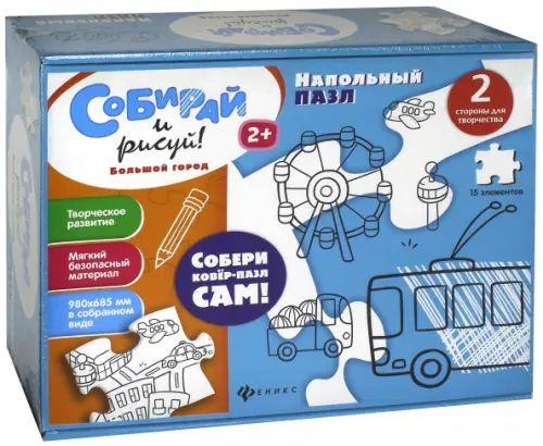 Напольный коврик-пазл «Собирай и рисуй» - зто двусторонний пазл с крупными деталями, удобными для детских ручек, который собирают преимущественно на полу из за достаточно больших размеров. Детали таких детских ковриков-пазлов достаточно крупные для того, чтобы их могли использовать в игре совсем маленькие дети. Коврик-пазл «Собирай и рисуй» не просто коврик и не просто пазл. Это огромная раскраска с одной стороны и многоразовое поле для рисования - с другой. Специальное покрытие позволит ребенку рисовать и писать бесконечное множество раз, ведь следы фломастера легко стираются с поверхности пазла и можно писать снова и снова, все лучше и лучше!