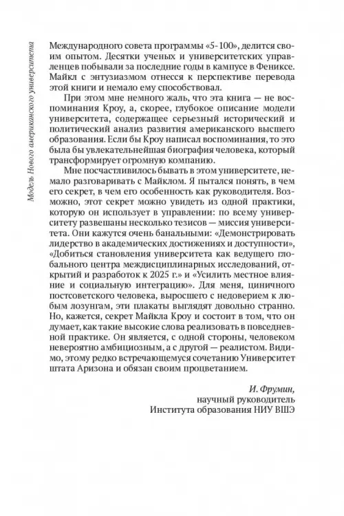 Американские исследовательские университеты неизменно лидируют в международных рейтингах, однако их институциональная модель все более отстает от целей, которые стоят перед ними сегодня. Для сохранения социального благополучия и экономической конкурентоспособности необходима новая модель, предполагающая широкую доступность качественного образования. Майкл Кроу, заняв в 2002 г. пост президента Университета штата Аризона (ASU), предложил новую версию государственного исследовательского университета. В результате фундаментального концептуального обновления ASU превратился в мировой образовательный и интеллектуальный центр - наглядный прототип предлагаемой модели Нового американского университета. Ее особенности - высочайшее академическое качество в сочетании с широким доступом к образованию для всех слоев населения, а также максимальное участие в жизни общества. В этой книге Майкл Кроу и историк образования Уильям Дэбарс рассматривают возникновение американских исследовательских университетов и обсуждают необходимость обновления модели, лежащей в их основе. Благодаря институциональным инновациям, утверждают они, университеты могут формировать свою неповторимую идентичность, которая позволит им в наибольшей степени реализовать их потенциал и создавать идеи, продукты и процессы, меняющие качество жизни и способствующие национальной экономической устойчивости. Книга адресована преподавателям, руководителям университетов, управленцам и исследователям высшего образования.