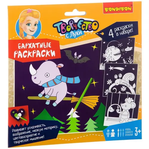Раскраска способствует развитию усидчивости, воображения, мелкой моторики, цветовосприятию и творческому мышлению. Бархатный фон дает возможность красиво раскрасить изображение, не выходя за пределы раскрашиваемой зоны. Благодаря этому рисунки получаются яркими и аккуратными.