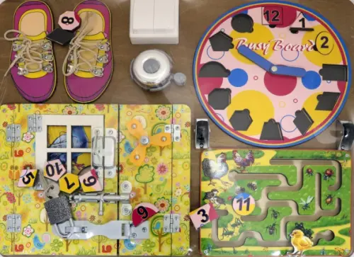 На доске Busy Board можно увидеть и оригинальный лабиринт, и большое количество различных замков, к которым нужно подобрать ключ, и выключатели разнообразной формы, куда можно нажать, и даже небольшой звонок, издающий забавные звуки. Все это позволит ребенку увидеть загадку в самых казалось бы обычных предметах домашнего обихода.