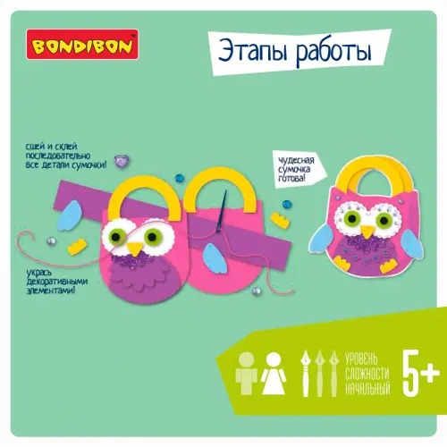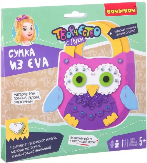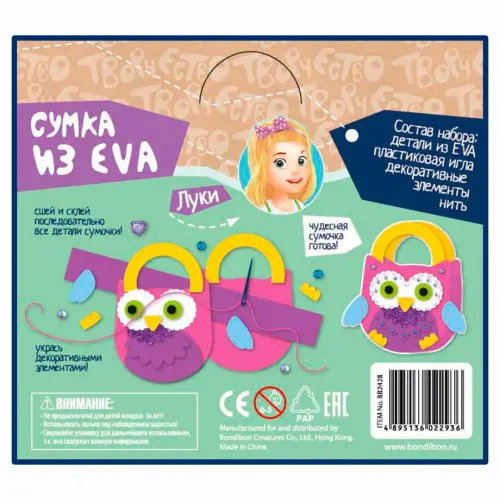 Чудесный набор по созданию сумки из ЕVA - прочного, легкого материала. Все необходимое - для создания и украшения сумочки мечты - в наборе детали из ЭВА, пластиковая игла, декоративные элементы, нить. Набор абсолютно безопасен - в составе пластиковая игла и перфорированные самоклеящиеся детали. Работа с этим набором развивает творческое мышление, мелкую моторику, концентрацию внимания.