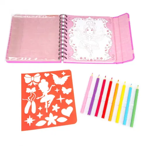В состав набора входит: 18 страниц раскраски, трафарет, лист с наклейками, набор цветных карандашей.
