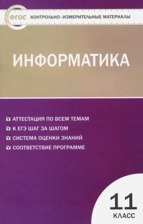 В пособии представлены контрольно-измерительные материалы (КИМы) по информатике для 11 класса. Издание составлено в соответствии с требованиями ФГОС. Структура КИМов аналогична структуре заданий ЕГЭ, что позволит постепенно подготовить учащихся к работе с подобным материалом. В конце издания предложены ответы к тестам.