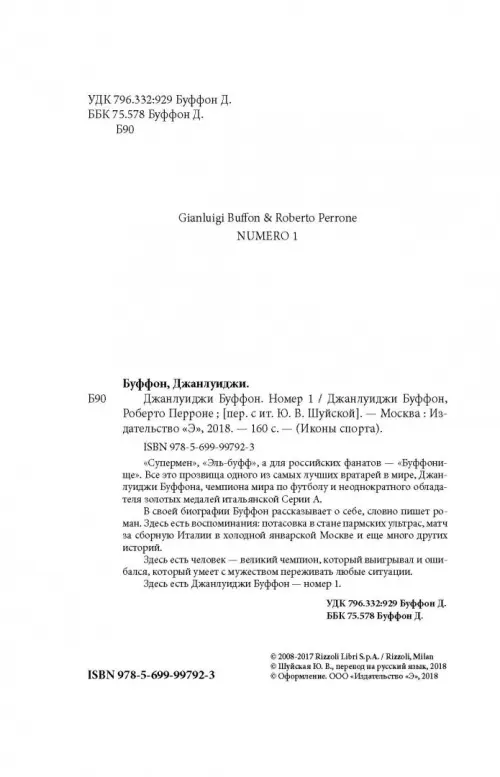 Если вы обнаружили ошибку в описании товара «Джанлуиджи Буффон. Номер 1» (авторы: Буффон Джанлуиджи, Перроне Роберто), то выделите её мышкой и нажмите Ctrl+Enter. Спасибо, что помогаете нам стать лучше!