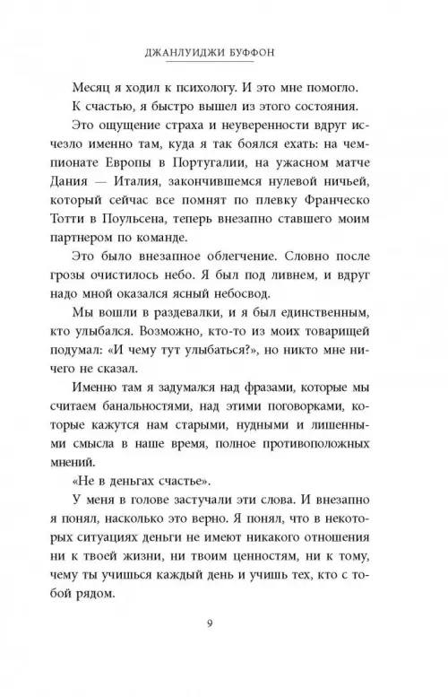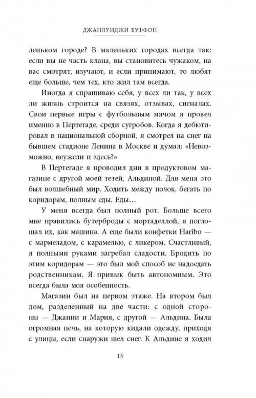 В своей биографии Буффон рассказывает о себе, словно пишет роман. Здесь есть воспоминания: потасовка в стане пармских ультрас, матч за сборную Италии в холодной январской Москве и еще много других историй.