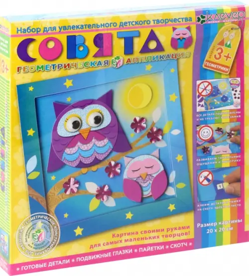 Состав: готовые детали из цветного картона, пайетки, подвижные пластиковые глазки, двусторонние клейкие квадратики (скотч).