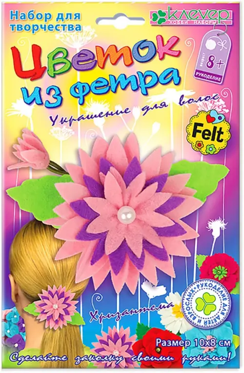 Состав набора: фетр, бусина, резинка, нитка, выкройка с деталями, инструкция на упаковке.