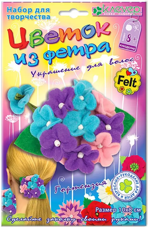 Изысканное сочетание голубых, фиолетовых и розовых маленьких цветочков гортензии придаёт изюминку причёске! Яркий объёмный цветок из мягкого фетра отлично смотрится в волосах, стягивая хвост или косу. Его также можно прикрепить на ободок для волос или пришить на кофточку или сумочку. Рукодельнице старше 8 лет будет несложно сделать его, нужно только обладать начальными навыками кройки и шитья: вырезать из фетра по выкройке детали цветка, сделать складки у лепестков и сшить детали между собой, нашить жемчужную бусину и прикрепить к резинке по инструкции. Созданное своими руками дизайнерское украшение украсит причёску, а само его создание доставит большое удовольствие!