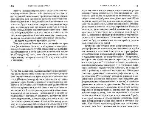 "Черные тетради" - так назвал Мартин Хайдеггер (1889-1976) клеенчатые тетради черного цвета с заметками и размышлениями разного рода, которые он вел с 1931 года. Набралось их тридцать четыре. Согласно воле автора, франкфуртское издательство Витторио Клостерманна приступило к их публикации после всех книг и курсов лекций. 95-й том Собрания сочинений М. Хайдеггера, перевод которого мы вам предлагаем, содержит записи, относящиеся к 1938-1939 годам ("Размышления VII-XI"). Издатель "Черных тетрадей" Петер Травны так охарактеризовал размышления Хайдеггера, опираясь на его собственную самооценку: это не "афоризмы" как свидетельства житейской мудрости, а "неприметные аванпосты - и арьергардные позиции" - в целостной попытке завоевания пути для начального вопрошания, которое в отличие от метафизического называет себя Бытийно-историческим мышлением. Этот метод философ применяет к ситуации в религии, искусстве и науке.
