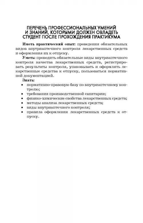 Учебно-методическое пособие состоит из двух разделов и содержит подробное описание 14 лабораторных работ по контролю качества лекарственных средств, необходимых для закрепления теоретического материала и приобретения практических навыков, умений и профессиональных компетенций. В пособие включены разнообразные лекарственные формы аптечного и заводского производства. Данное издание включает 5 приложений, содержащих необходимые для расчетов справочные и табличные данные, а также примерные формулы, необходимые для оформления лабораторных работ и ведения протоколов анализа. Для студентов среднего профессионального образования фармацевтических факультетов по специальности «Фармация».