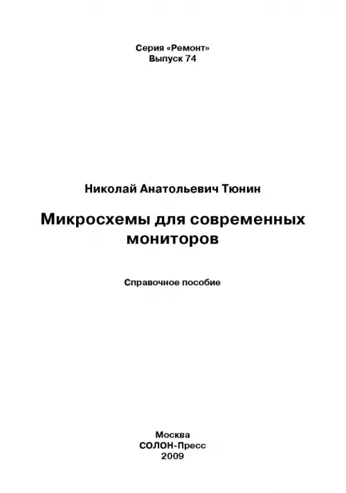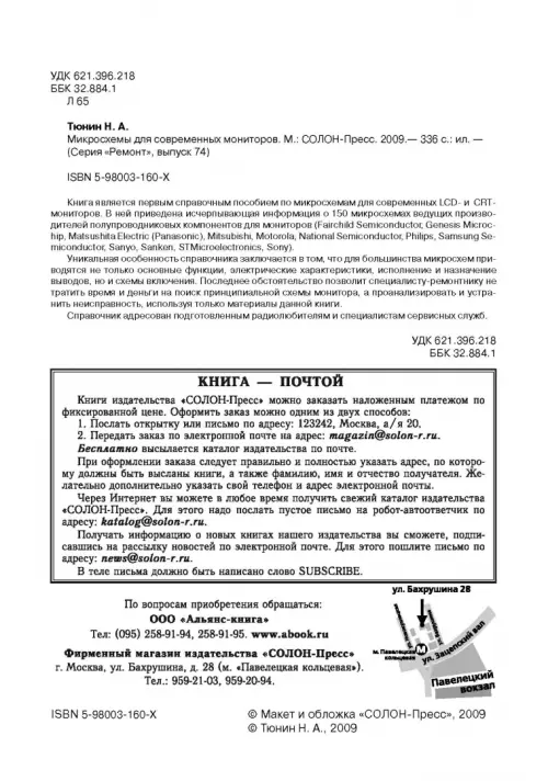 Книга является первым справочным пособием по микросхемам для современных LCD- и CRT-мониторов. В ней приведена исчерпывающая информация о 150 микросхемах ведущих производителей полупроводниковых компонентов для мониторов (Fairchild Semiconductor, Genesis Microchip, Matsushita Electric (Panasonic), Mitsubishi, Motorola, National Semiconductor, Philips, Samsung Semiconductor, Sanyo, Sanken, STMicroelectronics, Sony).