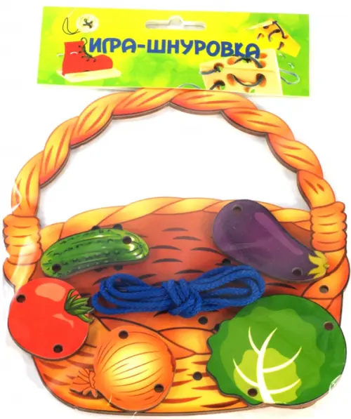 Прекрасный тренажер для развития мелкой моторики рук! Лукошко и набор овощей выполнены из дерева, отверстия хорошего размера, шнур достаточной длины.