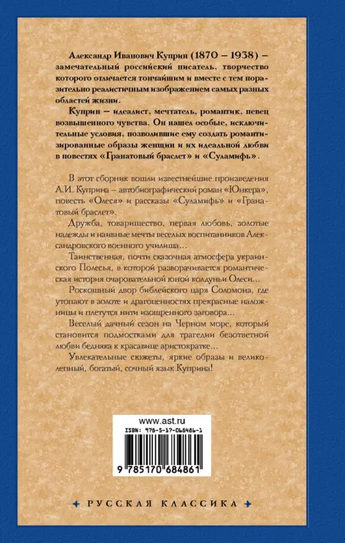 Если вы обнаружили ошибку в описании товара «Гранатовый браслет» (авторы: Куприн Александр Иванович), то выделите её мышкой и нажмите Ctrl+Enter. Спасибо, что помогаете нам стать лучше!