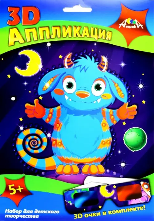 Набор для детского творчества "3D аппликация" состоит из состоит из цветной картонной основы размером 21х29 см, рисунок напечатан по специальной технологии, самоклеящихся гелевых картинок, разноцветных пайеток, клея ПВА, 3D очков. На основу приклейте гелевые элементы, используя клей ПВА украсьте аппликацию пайетками, мста для пайеток выделены контуром.С помощью волшебных очков картинка "оживет". Занятия с помощью этого набора развивают мелкую моторику, внимание, аккуратность. Набор рассчитан на детей от 5-ти лет. Все необходимые детали для поделки входят в состав набора.