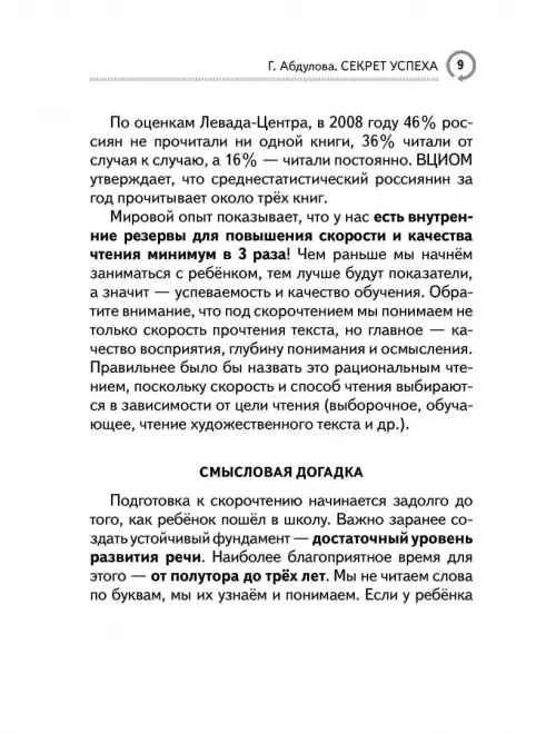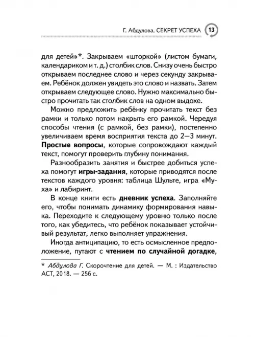 Скорочтение – один из самых важных навыков в современном мире, от которого во многом зависит карьера. Он позволяет управлять информационными потоками. Психологи пришли к выводу, что основа успеха – большой словарный запас и регулярная практика. В этой книге представлен уникальный тренажёр, который помогает значительно увеличить скорость чтения и глубину понимания. Ребёнок воспринимает текст через специальную рамку с окошками, привыкая пользоваться смысловой догадкой. Тренажёр более 17 лет активно применяется в школе интеллектуального развития «Супермозг». Тексты из золотого фонда детской литературы, систематизированные опытным методистом и руководителем школы «Супермозг» Г.Ф. Абдуловой, а также вопросы для проверки глубины понимания делают занятия с книгой максимально результативными.