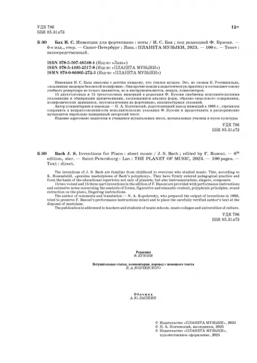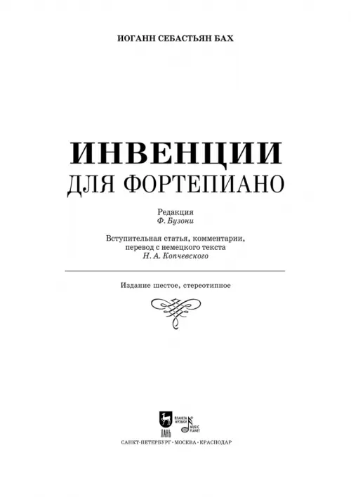 Инвенции И.С. Баха знакомы с детства каждому, кто учился музыке. Это, по словам К. Розеншильда, «подлинные шедевры баховской полифонии». Они прочно вошли в педагогическую практику и составляют основу учебного репертуара не только пианистов, но инструменталистов, певцов, композиторов. 15 двухголосных и 15 трехголосных инвенций в редакции Ф. Бузони снабжены исполнительскими указаниями и обширными примечаниями, касающимися анализа форм, образно-смыслового содержания, полифонических принципов, звукоизвлечения на фортепиано, аппликатурных указаний. Автор комментариев и перевода — Н.А. Копчевский, подготовивший выход инвенций в 1986 году, стремился сохранить в неприкосновенности исполнительские указания Ф. Бузони и предоставить в распоряжение музыкантов тщательно выверенный авторский текст. Издание адресовано педагогам и учащимся музыкальных школ, музыкальных училищ и вузов культуры.