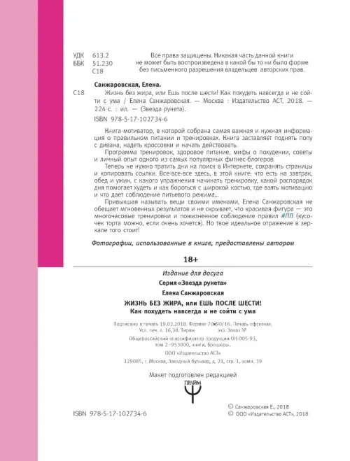 Операция ЗОЖЕсли вы обнаружили ошибку в описании товара «Жизнь без жира, или Ешь после шести! Как похудеть навсегда и не сойти с ума» (авторы: Санжаровская Елена Николаевна), то выделите её мышкой и нажмите Ctrl+Enter. Спасибо, что помогаете нам стать лучше!