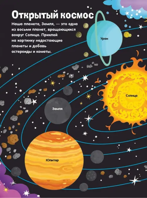 Книга с наклейками "Космос" порадует любого юного читателя, увлеченного звездами, планетами и покорением космоса. 100 наклеек в книге — это десятки разных космических штучек от звезд до спутников, а на каждом развороте открывается новое поле для творчества и освоения космического пространства!