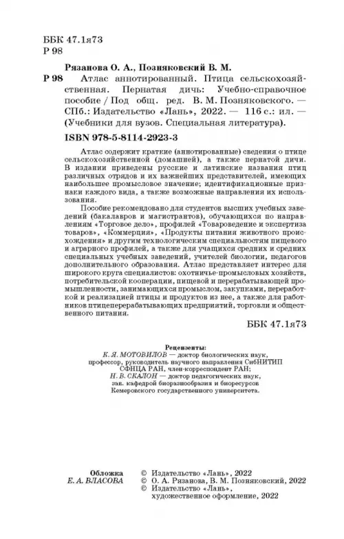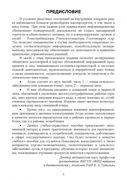Пособие рекомендовано для студентов высших учебных заведений (бакалавров и магистрантов), обучающихся по направлениям «Торговое дело», профилей «Товароведение и экспертиза товаров», «Коммерция», «Продукты питания животного происхождения» и другим технологическим специальностям пищевого и аграрного профилей, а также для учащихся средних и средних специальных учебных заведений, учителей биологии, педагогов дополнительного образования. Атлас представляет интерес для широкого круга специалистов: охотничье-промысловых хозяйств, потребительской кооперации, пищевой и перерабатывающей промышленности, занимающихся промыслом, закупками, переработкой и реализацией птицы и продуктов из нее, а также для работников птицеперерабатывающих предприятий, торговли и общественного питания.
