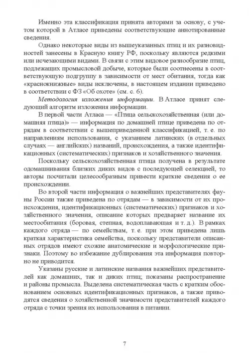 Атлас содержит краткие (аннотированные) сведения о птице сельскохозяйственной (домашней), а также пернатой дичи. В издании приведены русские и латинские названия птиц различных отрядов и их важнейших представителей, имеющих наибольшее промысловое значение; идентификационные признаки каждого вида, а также возможные направления их использования.