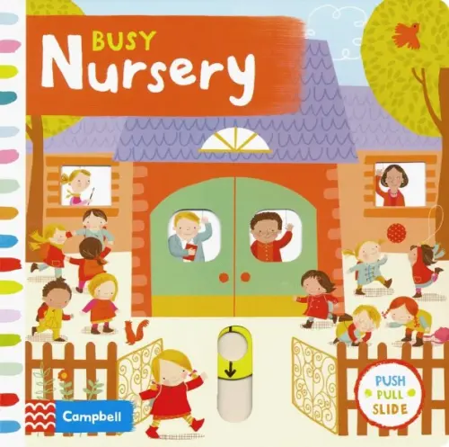 Experience your first day at school in Busy Nursery! Children can join in by pushing, pulling and turning the tabs to clamber up the climbing frame, learn new words, make dough models and have a fun-filled day at school!