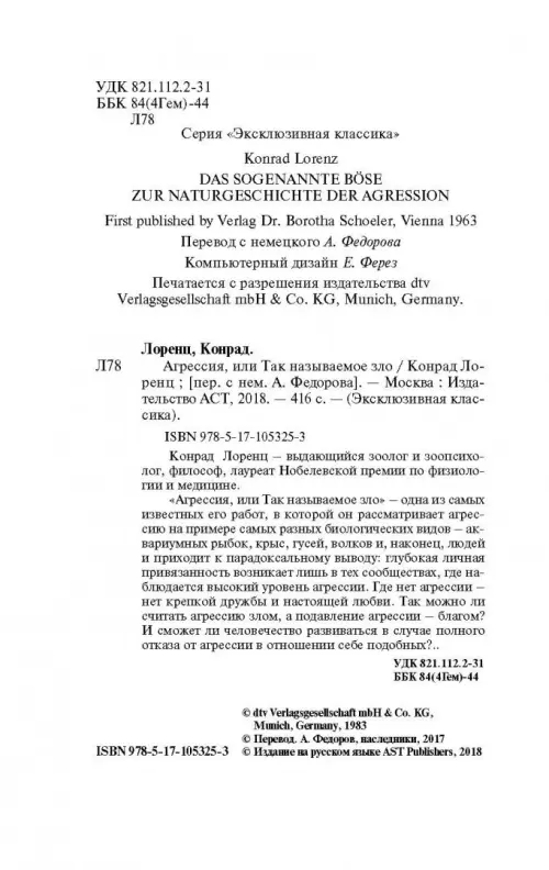 Если вы обнаружили ошибку в описании товара «Агрессия, или Так называемое зло» (авторы: Лоренц Конрад), то выделите её мышкой и нажмите Ctrl+Enter. Спасибо, что помогаете нам стать лучше!