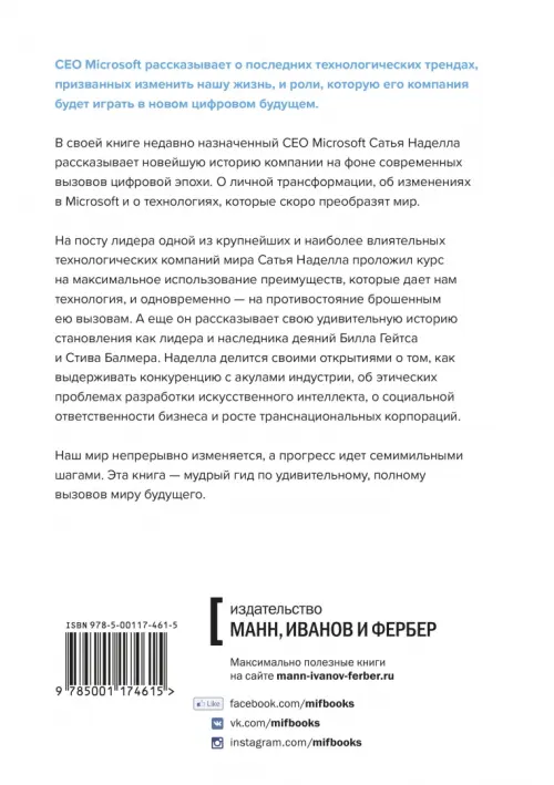 В своей книге новый CEO Microsoft Сатья Наделла рассказывает новейшую историю компании на фоне современных вызовов цифровой эпохи. О личной трансформации, об изменениях в Microsoft и о технологиях, которые скоро преобразят мир. О том, как выдерживать конкуренцию с акулами индустрии, об этических проблемах разработки искусственного интеллекта, о социальной ответственности бизнеса и росте транснациональных корпораций.