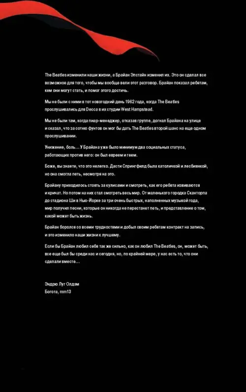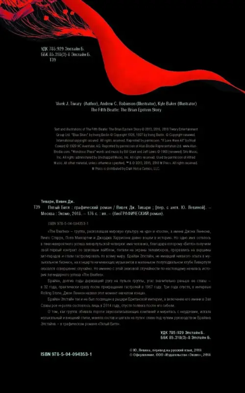 Брайан Эпстайн, «пятый битл» и менеджер группы, благодаря которому мир узнал о ливерпульской четверке, до сих пор остается неизвестным героем в невероятной истории покорения группой музыкального Олимпа. Бестселлер Нью-Йорк Таймс впервые раскрывает секреты этого загадочного гения в увлекательном графическом романе, основанном на автобиографии самого Эпстайна!