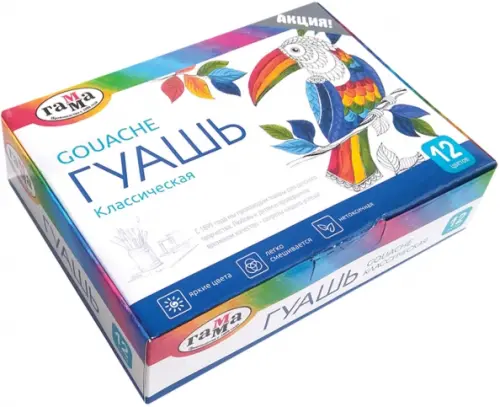 Если вы обнаружили ошибку в описании товара «Гуашь Гамма "Классическая", 12 цветов, 20 мл», то выделите её мышкой и нажмите Ctrl+Enter. Спасибо, что помогаете нам стать лучше!