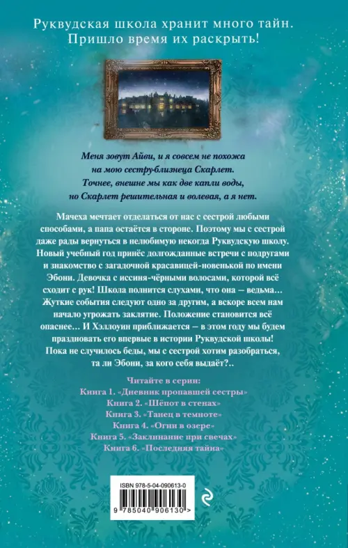 Мы с сестрой снова отправляемся в Руквудскую школу. На этот раз — с радостью. Ведь мачеха не хочет видеть нас в своём доме, сводные братья вредничают, а отец ничего не замечает. Новый учебный год принёс с собой не только долгожданные встречи с подругами, но и новые тайны и опасности. Загадочная новенькая по имени Эбони смогла удивить, казалось бы, готовых ко всему обитателей Руквудской школы! Ходят слухи, что она ведьма... И действительно, происходят пугающие события, и жизням наших подруг грозит опасность. Мы со Скарлет решили разобраться, кто же такая Эбони на самом деле, пока не случилось самое страшное…