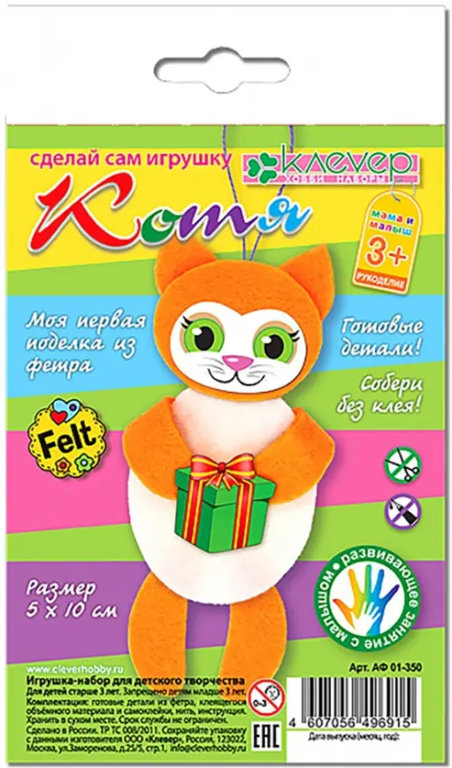 Забавный Котя с нарядным подарком в лапках – игрушка-подвеска из фетра для ребёнка старше 3-х лет. Мама поможет малышу склеить два овала клейкой объемной основы, приклеить нить-подвеску, готовые детали из фетра и самоклейки. Набор помогает ребёнку запомнить названия цветов, развивает мелкую моторику, тактильность, усидчивость и аккуратность. Ножницы и клей не понадобятся. Яркая игрушка-подвеска станет отличным подарком для мамы и бабушки, украсит детскую комнату и новогоднюю ёлку!