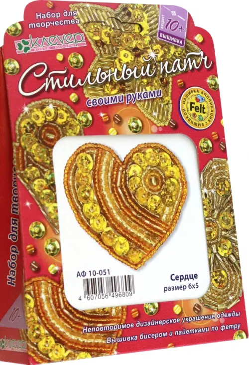 Стильный патч - модный тренд декорирования одежды и сумок, украшение-нашивка на мягком фетре. Рукодельница старше 10 лет легко нашьёт блестящие нити с бисером на фетр, добавит яркие пайетки и золотой стеклярус для акцентов, а затем вырежет изделие по контуру - стильный патч готов! Результатом увлекательного творчества с набором станет переливающееся бисерное чудо – огненно-золотое сердце, превращающее обычные вещи в ультрамодные.