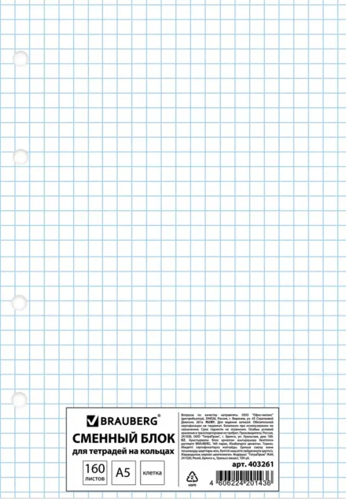 Если вы обнаружили ошибку в описании товара «Сменный блок к тетради на кольцах "Brauberg Эко", А5, 160 листов, клетка», то выделите её мышкой и нажмите Ctrl+Enter. Спасибо, что помогаете нам стать лучше!
