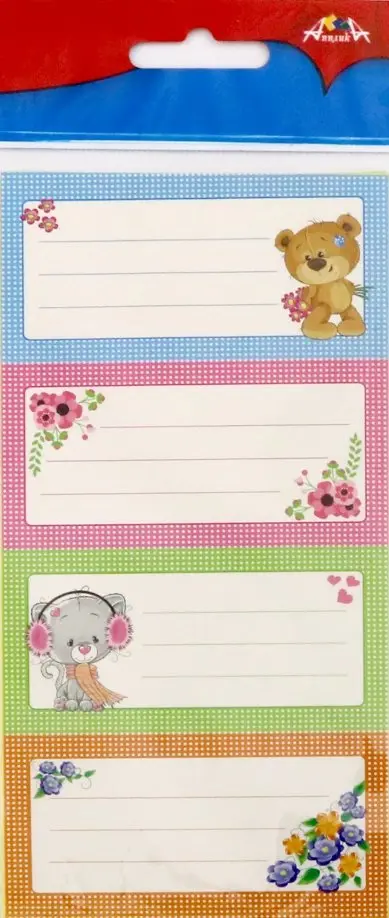 Наклейки школьные с рисунком для девочек, 12 штук, прямоугольные, размер одной наклейки 75х35 мм. В наборе - 3 листа по 4 наклейки, размер листа - 83х165 мм. Материал наклейки - бумага с клеевым слоем. Упаковка - ПЭТ-пакет с европодвесом._x000D_