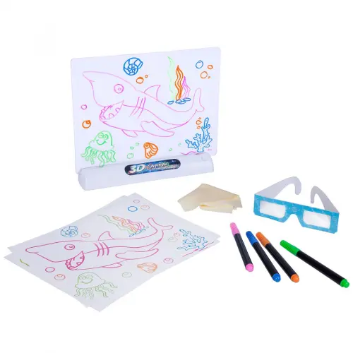 Рисовать очень легко - достаточно приложить один из трафаретов и перенести рисунок, используя для этого цветные маркеры, входящие в комплект. Маркеры заполнены флуоресцентной краской, в светодиодном свете они будут "сиять", усиливая эффект. Для того чтобы насладиться 3D эффектом, достаточно надеть очки, также имеющиеся в наборе. Можно выключить свет - тогда рисунок на доске будет выглядеть еще красочнее и впечатляюще.
