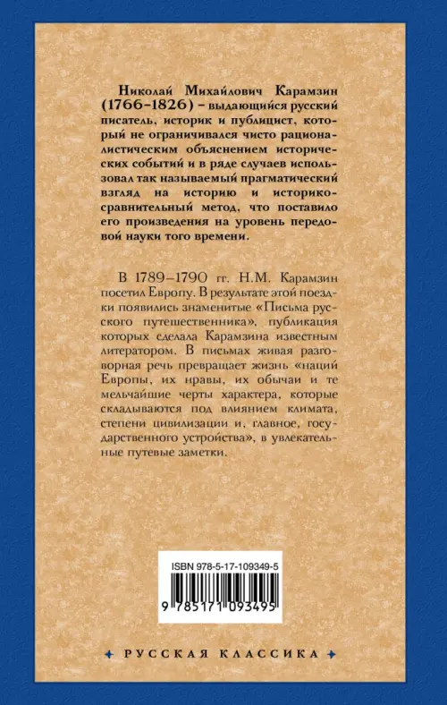 255 лет со дня рождения Н.М. КарамзинаЕсли вы обнаружили ошибку в описании товара «Письма русского путешественника» (авторы: Карамзин Николай Михайлович), то выделите её мышкой и нажмите Ctrl+Enter. Спасибо, что помогаете нам стать лучше!