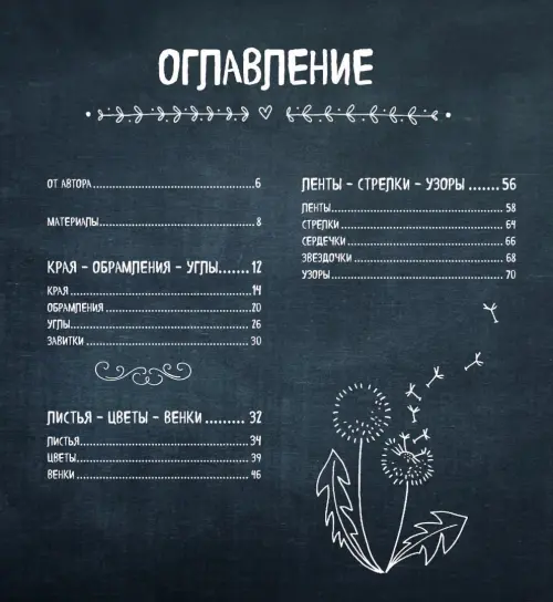 Примеры декоративных элементов разделены по тематикам: от самых простых рамок, стрелок, завитков, цветов и лент до более сложных иллюстраций и разных вариантов алфавита.
