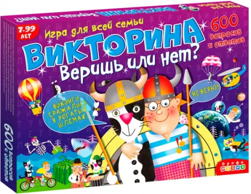 Занимательная викторина для всей семьи поможет проверить свою эрудицию и детям, и родителям. В игре вы найдёте 600 занимательных утверждений на 100 самых разных тем: вселенная, липучки, червяки, магниты, огонь, капли, народы, зелёный цвет, австралия, каша, обезьяны, башни, сон, скорость и многое другое.