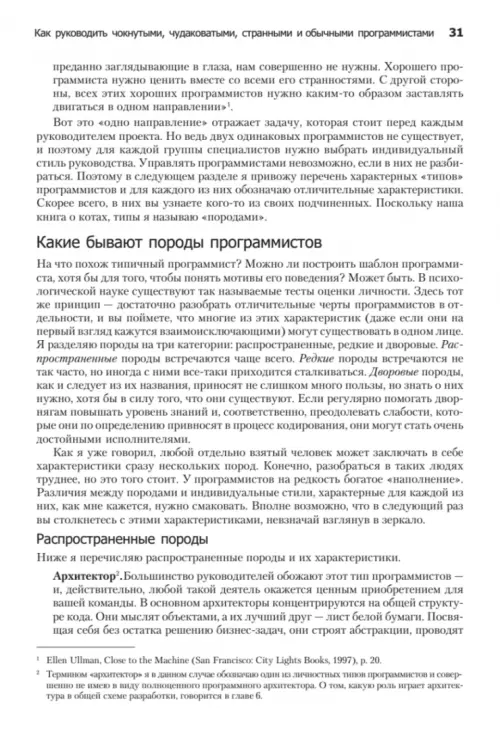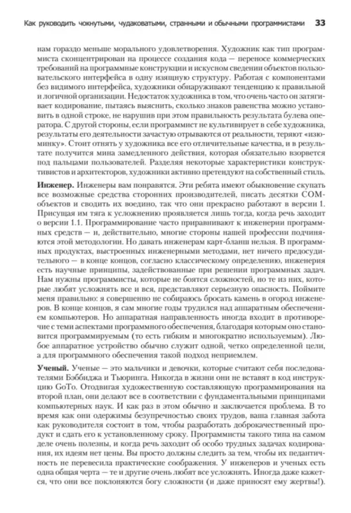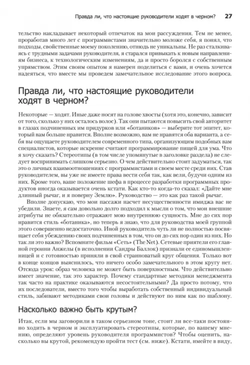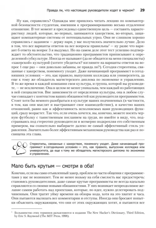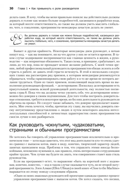«Как пасти котов» — это книга о лидерстве и руководстве, о том, как первое совмещать со вторым. Это, если хотите, словарь трудных случаев управления IT-проектами. Программист подобен кошке, которая гуляет сама по себе. Так уж исторически сложилось. Именно поэтому так непросто быть руководителем команды программистов. Даже если вы еще месяц назад были блестящим и дисциплинированным программистом и вдруг оказались в роли менеджера, вряд ли вы знаете, с чего надо начать, какой выбрать стиль руководства, как нанимать и увольнять сотрудников, проводить совещания, добиваться своевременного выполнения задач. В таком случае без этой книги вам не обойтись. А может быть, вы — опытный менеджер, желающий пересмотреть свои принципы лидерства? Тогда, опять же, эта книга для вас. Вне зависимости от возраста, пола и социального статуса она поможет вам укрепить свои позиции в роли лидера программистов. Материал изложен довольно компактно и легко укладывается в голове. Стоя в книжном магазине и раздумывая, что же купить, задайте себе один простой вопрос: «Нужно ли мне совершенствовать свои лидерские навыки?» Полагаю, вы ответите: «Да», — а значит, данная книга окажется для вас небесполезной.